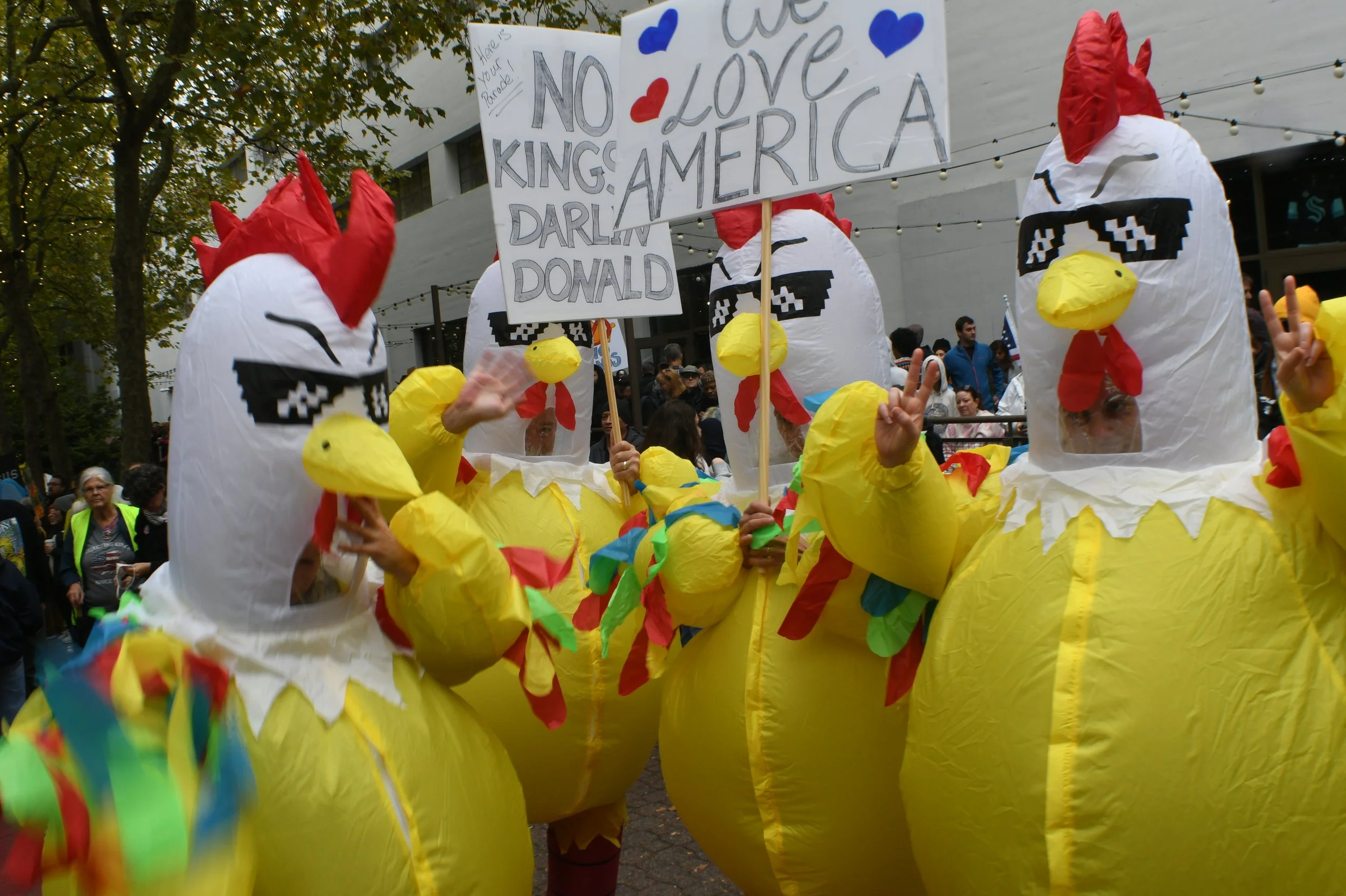 Following the speeches we marched from Seattle Center down 5th Ave. to the Pike Place Market area. Creativity was on display with flags, costumes and signs. Some memorable examples are “Love Not Hate–Don’t Take the Bait” or “No Faux King Way” or “Peaceful, Patriotic and Pissed Off” or “Aunt Tifa” or “Auntie Fa”. Signs with a QR code offered a range of next step options for individuals. WSI carried its logo banner and several members held “No Crown” signs.